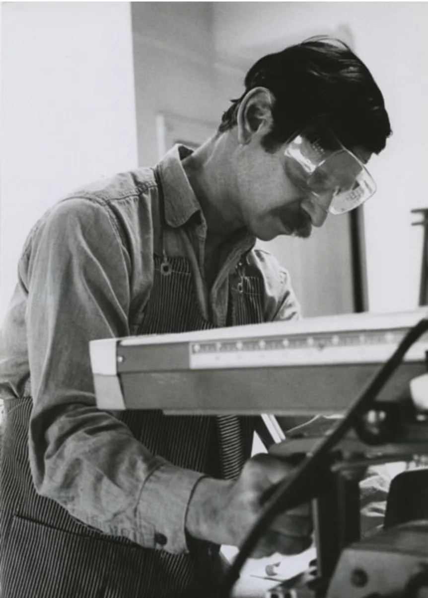 Trying to find a way to add movement to the white static planes of his Knife Drawings, Mon Levinson began to experiment with transparency using film and Plexiglas. Levinson found that by applying tape to Plexiglas in thin lines and then layering sheets together in a shallow box, he could create patterns that appeared to move when a viewer shifted his position. Through this experimentation with transparency, Levinson discovered the phenomena called the moiré effect, which occurs when two or more sets of parallel lines overlap at an angle. Levinson’s parallel lines were first applied by hand, which limited his experimentation. From 1965 on, Levinson used silkscreening to create his patterned Plexiglas sheets and photographically enlarged a product called Zipatone for the consistent waving lines in the paper backgrounds of his constructions.