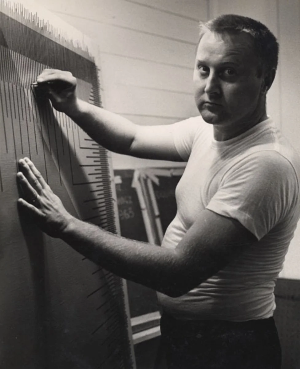 Museum interest in Anuszkiewicz continued to grow in the early 1960s. The Whitney Museum of American Art included Anuszkiewicz in its 1962 exhibition Geometric Abstraction in America, its 1963 annual, and the 1967 exhibition Art of the United States, 1670-1966. In 1963 the Museum of Modern Art featured Anuszkiewicz in its Americans 1963 exhibition and Time magazine published a story on him. In MoMA’s 1965 exhibition The Responsive Eye curated by William Seitz, Anuszkiewicz was featured as one of the preeminent American Op artists. Also in 1965 Anuszkiewicz had his first solo exhibition with the Sidney Janis Gallery in New York, where he had further solo exhibitions in 1967, 1969, and 1973. Anuszkiewicz exhibited three works at the 1965 Corcoran Biennial in Washington, DC, in addition to making the Biennial’s exhibition poster. Anuszkiewicz was included in American Art Today at the 1964 New York World’s Fair and American Painting Now at the United States Pavilion at Expo ‘67 in Montreal, Canada.