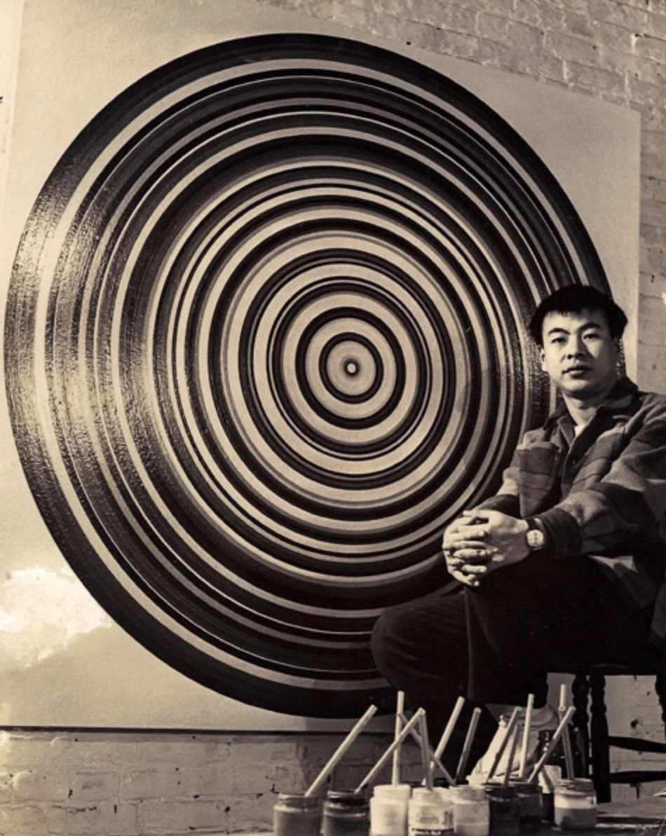 Tadasky (Tadasuke Kuwayama) was born in Nagoya, Japan. He painted since childhood, but as a youngster was steered toward his father’s business of shrine-building. This led him to study applied engineering at university in Tokyo and learn the craft of miyadaiku (shrine carpenters) in the family factory. Tadasky taught himself about modern and Western art from books. His eyes were opened to the power of abstraction through the work of Josef Albers and other Bauhaus artists; art made up of simple squares and other geometric elements was essentially prohibited in the Japanese art tradition. In Japan, Tadasky experimented with many forms of art, including representational painting, but by the time he applied for scholarships to the United States, he was experimenting with simple circles in larger constructions.